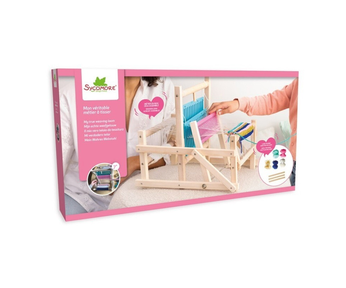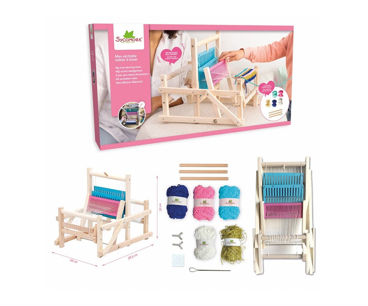 Ειναι κατασκευασμένος από ξύλο ενώ τα χτένια του ειναι από πλαστικό. Έχει διαστάσεις 27x39x32 cm και διπλώνει για ευκολία στην αποθήκευση και τη μεταφορά. Περιλαμβάνει 5 διαφορετικά κουβάρια μαλλιού, 3 ξύλινες σαϊτες και αναλυτικές , εγχρωμες οδηγίες με εικόνες.