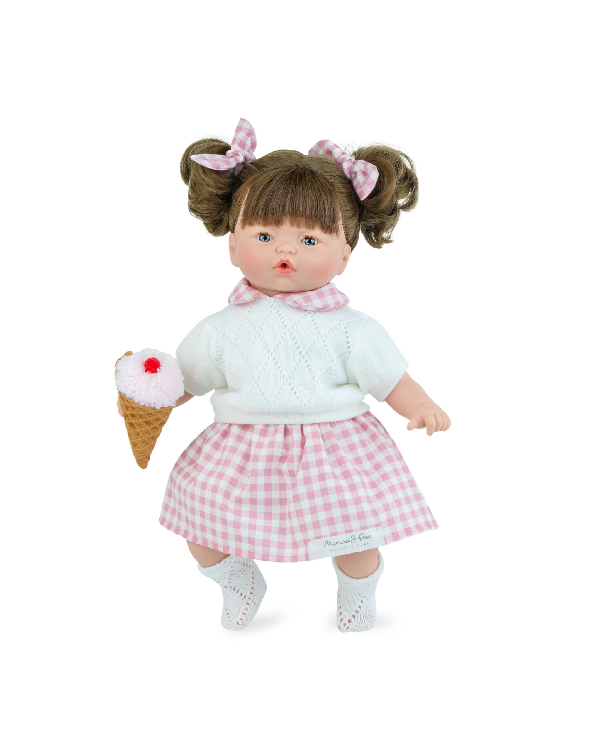 Όμορφη, αυθεντική ισπανική κούκλα Marina & Pau. Έχει μαλακό σώμα με κεφάλι, χέρια και πόδια από βινύλιο. Φοράει ρούχα από ποιοτικά υφάσματα και είναι ελαφρώς αρωματισμένη με άρωμα βανίλιας. Κρατάει ενα παγωτό.