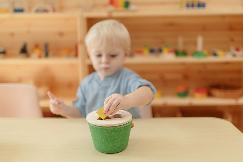 Ξύλινο κουβαδάκι με αποσπώμενο καπάκι με 3 υποδοχές για τα βασικά γεωμετρικά σώματα. Περιλαμβάνονται 3 γεωμετρικα σωματα σε διαφορετικο χρώμα το καθενα. Τα παιδιά μαθαίνουν να αναγνωρίζουν τα σχήματα, εξασκουνται σε διαφορετικές λαβές, ανακαλύπτουν αιτιο και αποτέλεσμα και εξασκούνται στην επίλυση προβλημάτων.