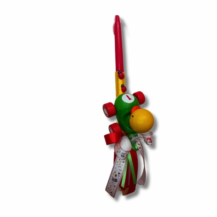 Χειροποίητη λαμπάδα με ξύλινο αυτοκινητάκι με παπάκι. Ιδανική πρώτη λαμπάδα καθώς το παιχνίδι αυτό δίνεται από 12 μηνών