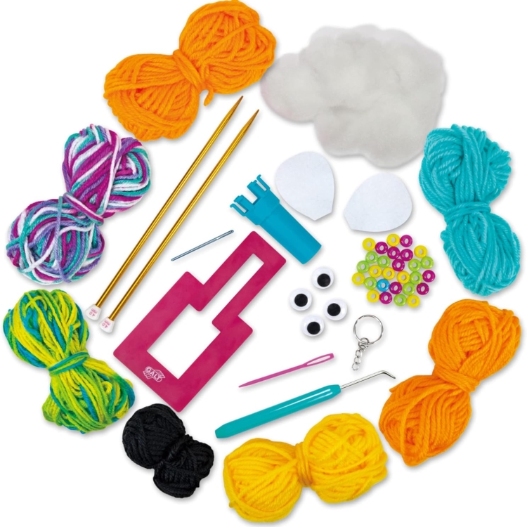 Το σετ περιλαμβάνει 7 κουβάρια με μάλλινη κλωστή, βελόνες πλεξίματος, εργαλείο κατασκευής pompom, εργαλείο κατασκευής κυλινδρικής πλέξης (tricotin), αλυσίδα για κλειδιά, 2 διακοσμητικά από αφρώδες υλικό, 28 χάντρες, ματακια χειροτεχνιας, χονδρή βελόνα ραπτικής και αναλυτικό οδηγό. Με όλα ταπαραπάνω μπορείτε να κατασκευάσετε 2 ζωακια (μελισσα και χταπόδι), ενα μπρελοκ με 3 pompom και ενα κασκολ.
