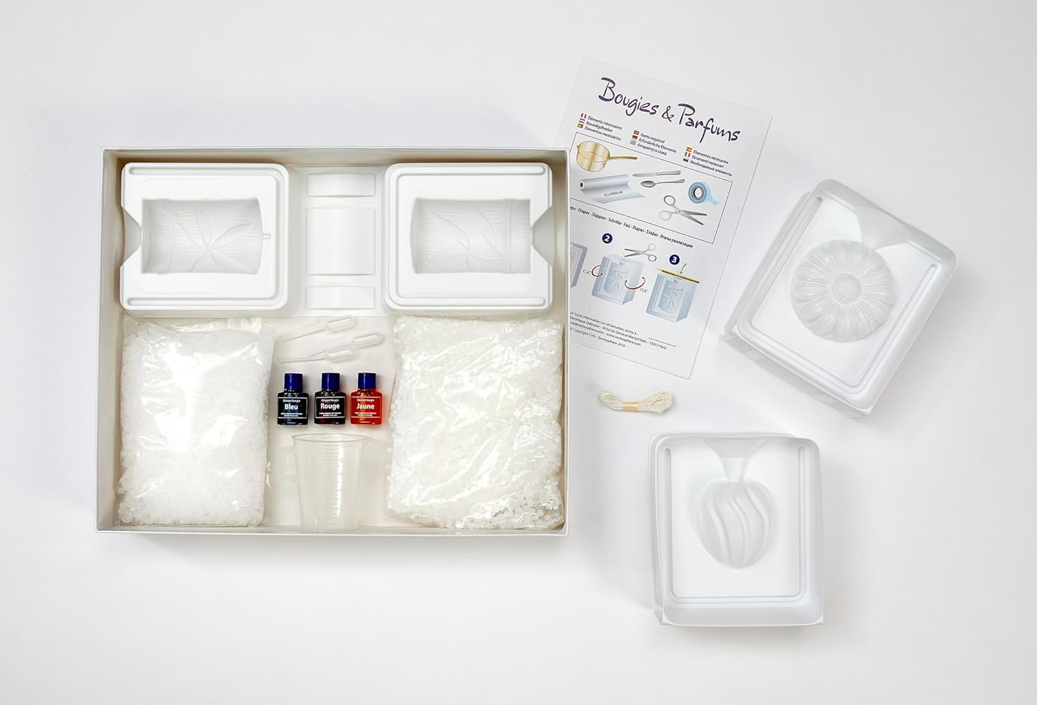 Το σετ περιλαμβάνει φυσικό κερί, αρωματικά έλαια, καλούπια, φυτίλια και λεπτομερείς οδηγίες για να καθοδηγήσουν τους χρήστες στη διαδικασία κατασκευής κεριών.
