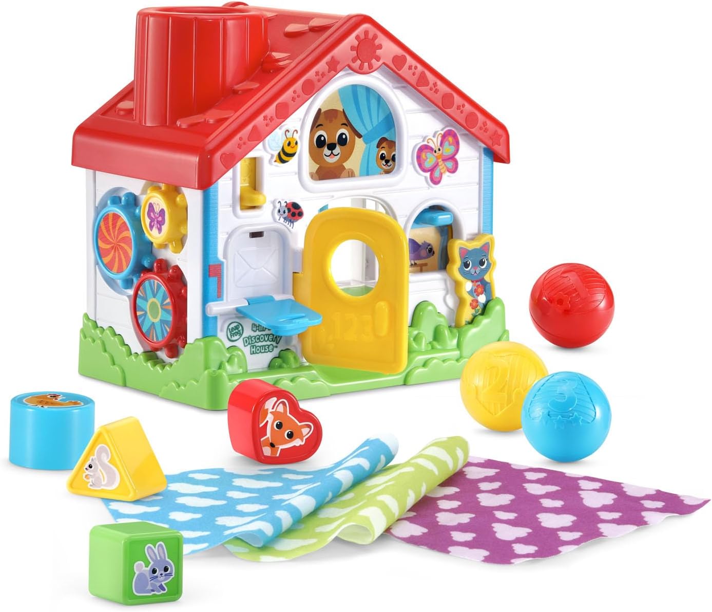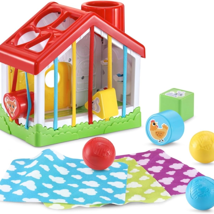 Βρεφικό παιχνίδι δραστηριοτήτων, κατάλληλο από 6 μηνών. Ένα σπιτάκι ανακάλυψης που περιλαμβάνει 4 σχήματα για ταξινόμηση, τρία μπαλάκια , 3 υφασμάτινα μαντηλάκια και διαφορετικές δραστηριοτητες σε κάθε πλευρά του: γρανάζια, πορτάκια και μαλακά λαστιχάκια, όλες απαραίτητες για την εξάσκηση λεπτών δεξιοτήτων, συντονισμού και επιλυσης προβλημάτων!