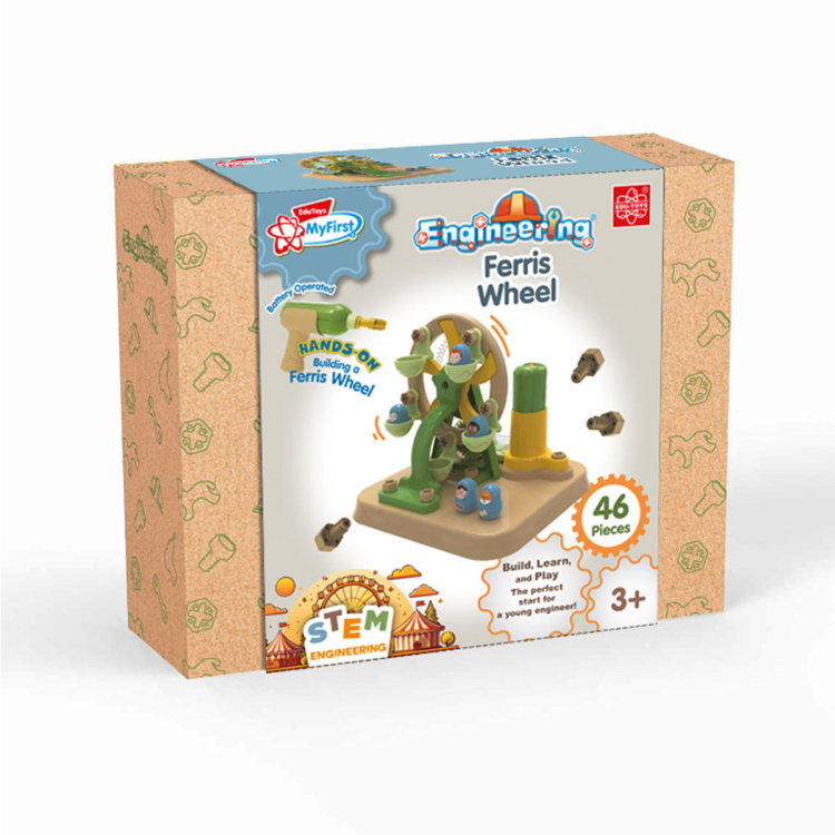 STEM παιχνίδι κατασκευής περιλαμβάνει μια ρόδα του λούνα παρκ έτοιμη για συναρμολόγηση, 5 φιγούρες και ένα ηλεκτρικό κατσαβίδι με μπαταρίες.