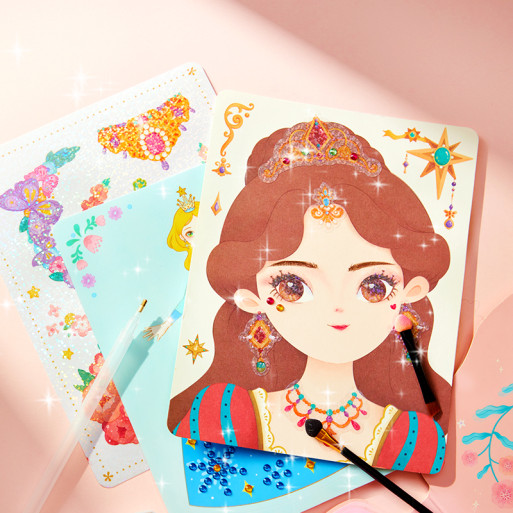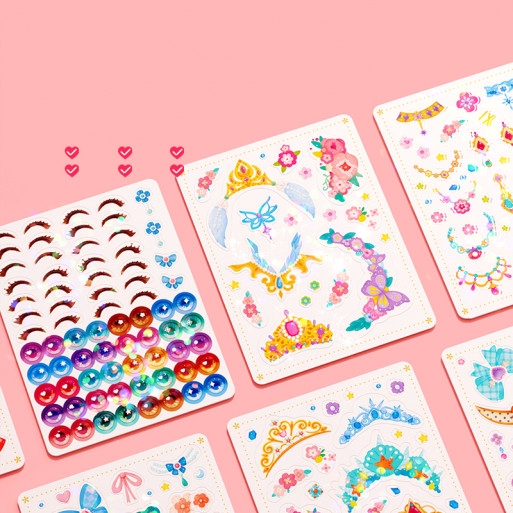 20 πρότυπα μακιγιάζ, 4 σετ αυτοκόλλητων (διαμάντια, γκλίτερ, κανονικά), 900 διακοσμητικές πέτρες (diamonds), 10 υφασμάτινα υλικά, 6 χρώματα μακιγιάζ, 1 παλέτα, 1 μολύβι εφαρμογής, 1 κόλλα, 2 πινέλα