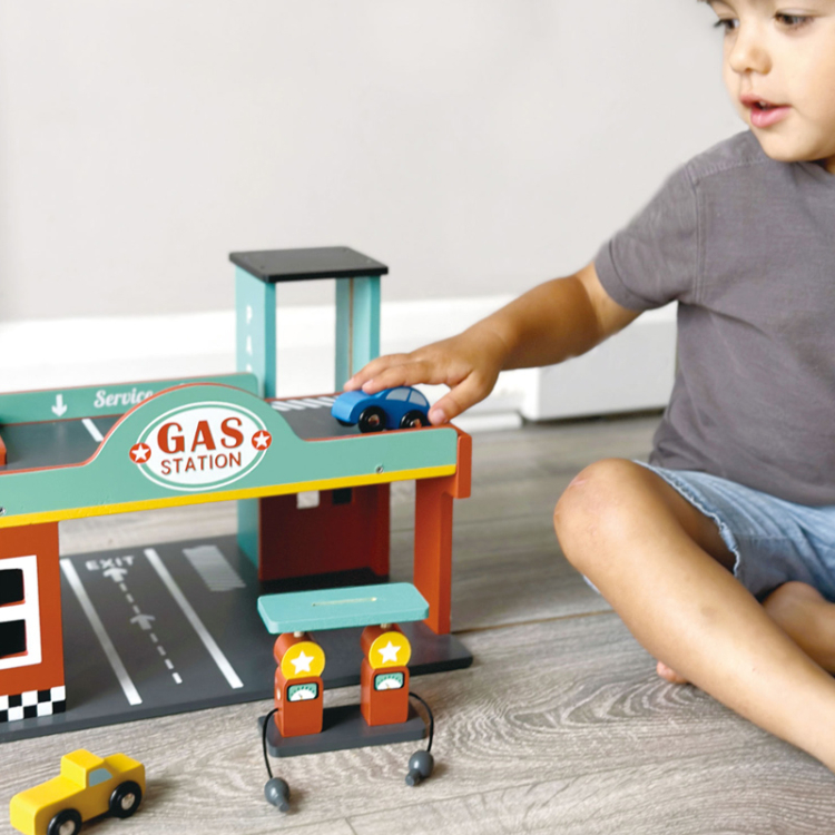 Αυτό το ξύλινο παιχνίδι βενζινάδικο και γκαράζ αυτοκινήτων διαθέτει τυπωμένο σανίδα δρόμου και ανελκυστήρα για να μεταφέρει τα αυτοκίνητα στον πρώτο όροφο. Μια ράμπα τύπου δρόμου για 3 διαφορετικά αυτοκίνητα, 2 μικρές αντλίες βενζίνης για να γεμίσετε το αυτοκίνητό σας!